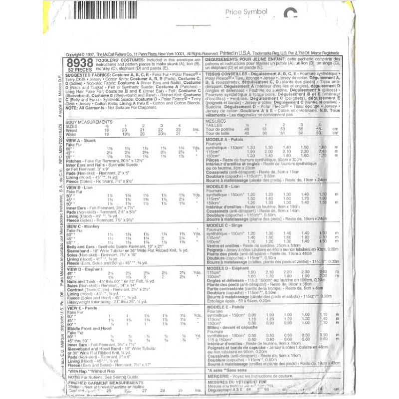 McCall's Vintage Costumes Pattern 8938 FF/UC Baby Size 2 Elephant Panda Skunk