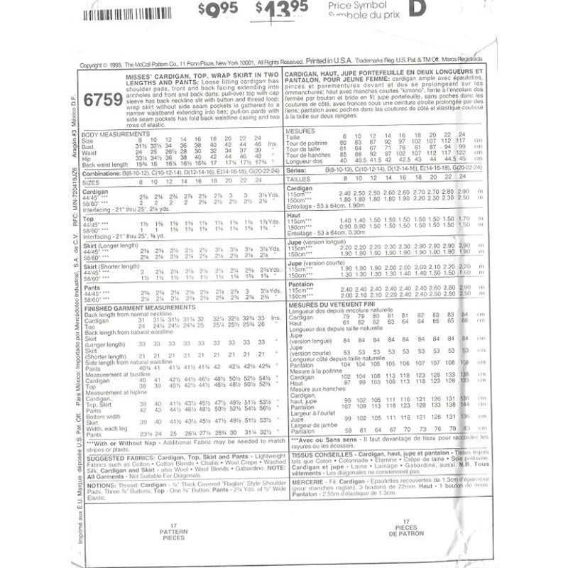 Sewing Pattern includes Cardigen, Top, Skirt (Longer), Skirt (Shorter), & Pants!