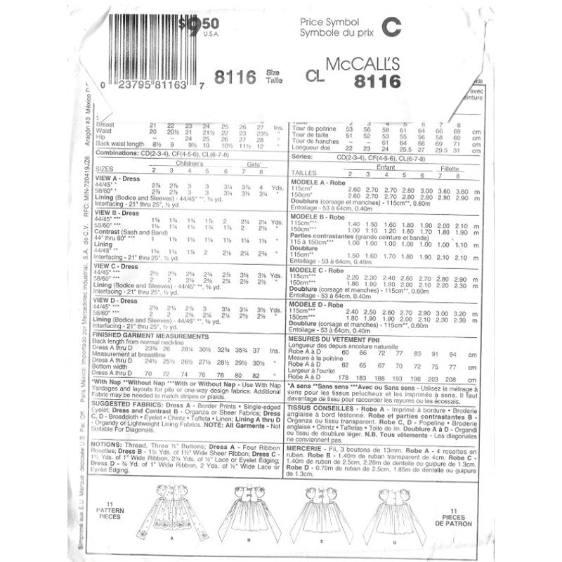 McCall's Vintage Sewing Pattern 8116 FF/UC Childrens Dresses Size Large (6,8,10)