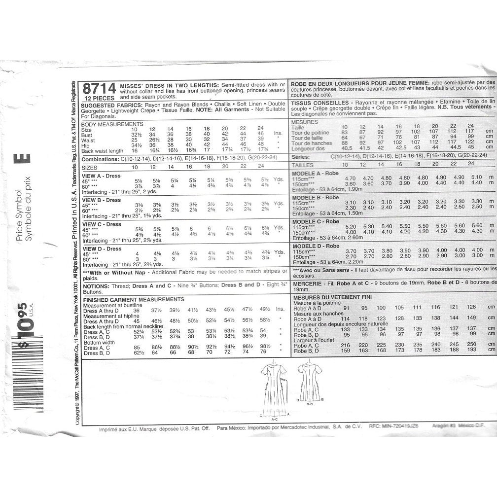 McCall's Vintage Sewing Pattern 8714 FF/UC Women's Sizes 12, 14, 16 Dresses